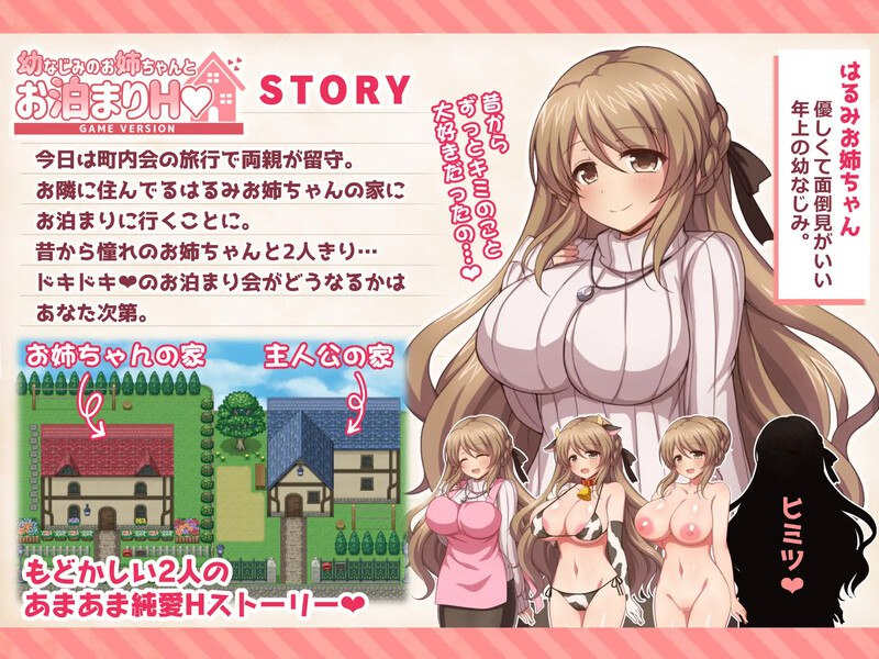 今天父母要出席自治会旅行,不在家。决定去邻居春美姐姐家留宿。一直憧憬姐姐的两人相处…在浴室接受胸交,在姐姐的房间遇见甜蜜H,捉弄睡着的姐姐,接受奶咬手交…这是与心爱的姐姐度过甜蜜且官能的夜晚的故事。